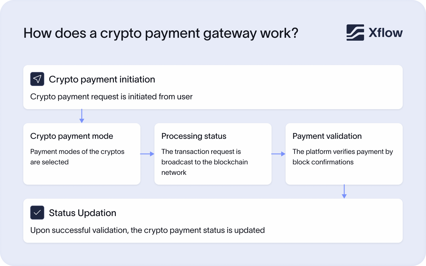 A crypto payment gateway handles the technical end of cryptocurrency payments. It starts from payment initiation by the customer, after which an invoice is generated, and the payment is sent through a blockchain network and validated. The merchant is notified. Depending on the gateway, funds can either be settled in cryptocurrency or automatically converted to fiat