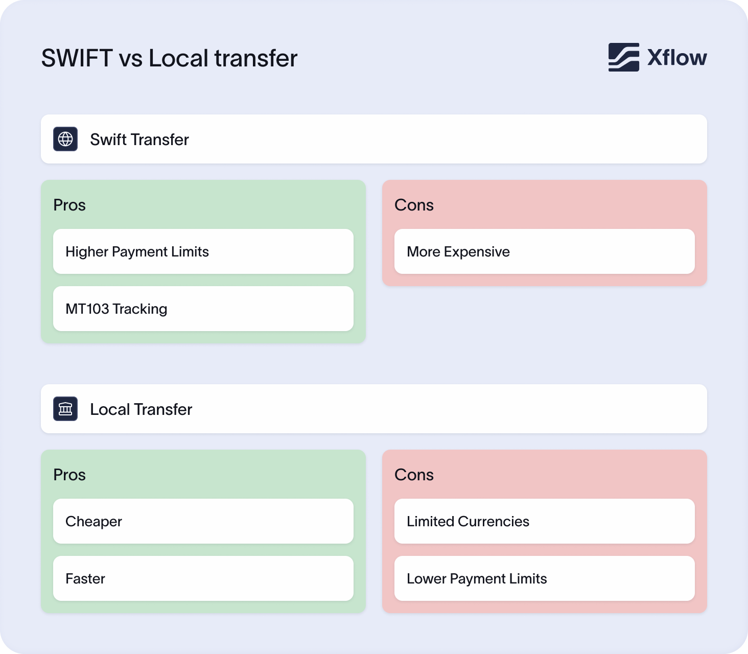 | Feature | SWIFT transfer | Local payout (e.g., Xflow) |